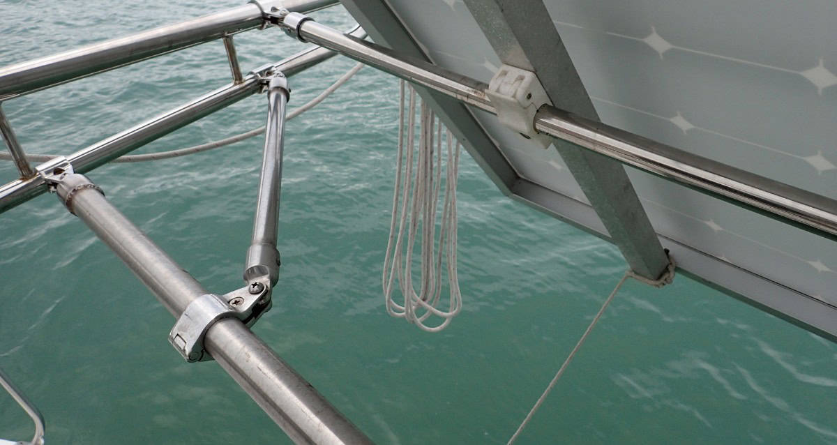 We’ve done several stainless tubing projects on Barefoot Gal: added bimini supports, made a mounting bar for the solar panel and, most recently, added a bar in place of a lifeline and beefed up our dinghy davits.