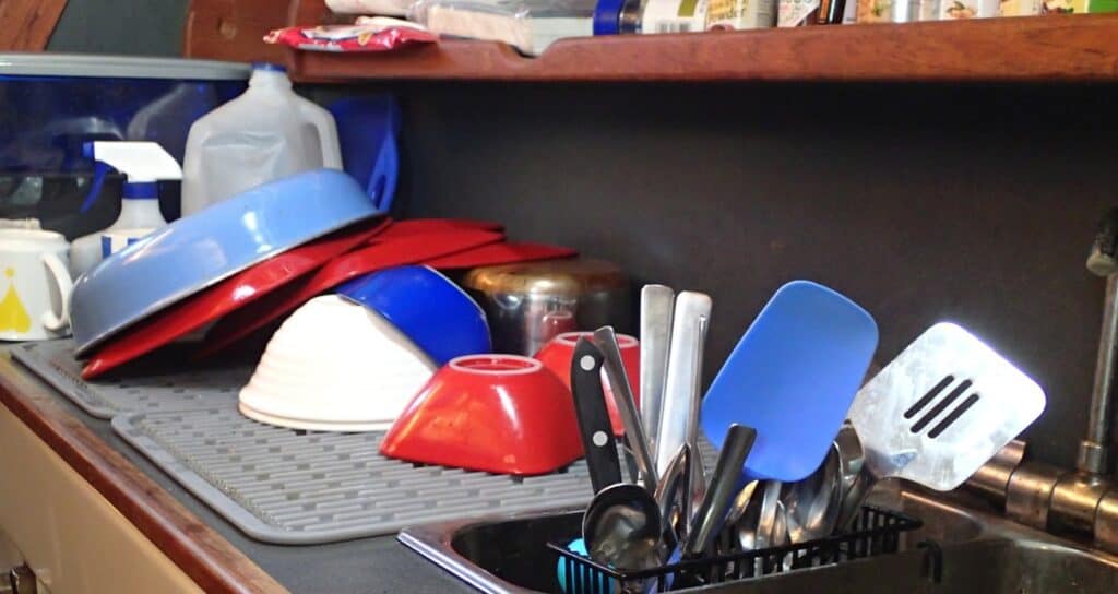 When I was on the boat I used a plastic tray with a piece of non-skid below it and a towel in it as a dish rack. Took a bit of creative stacking to get items close to vertical so they could drain and dry. The “ah ha” moment came when I realized that I could lean dishes (or pans) against the cupboard that was behind my drying “rack”. This might help others…and would work wonderfully well with these silicone mats. Wish I’d had them.