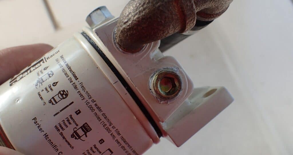- In changing the valves, Dave had to remove our dual Racor assembly. He checked it over thoroughly for any loose connections and — lo and behold! — found that one of the unused port plugs had never been screwed in all the way, let alone had any thread sealant used on it. He fixed that, and we were confident that we had the problem licked.